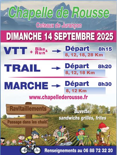 Le foyer de Chapelle de Rousse organise le 14 Septembre la 27ème Rando Marche Trail et VTT dans le vignoble sur les coteaux de Jurançon à la Chapelle de Rousse.